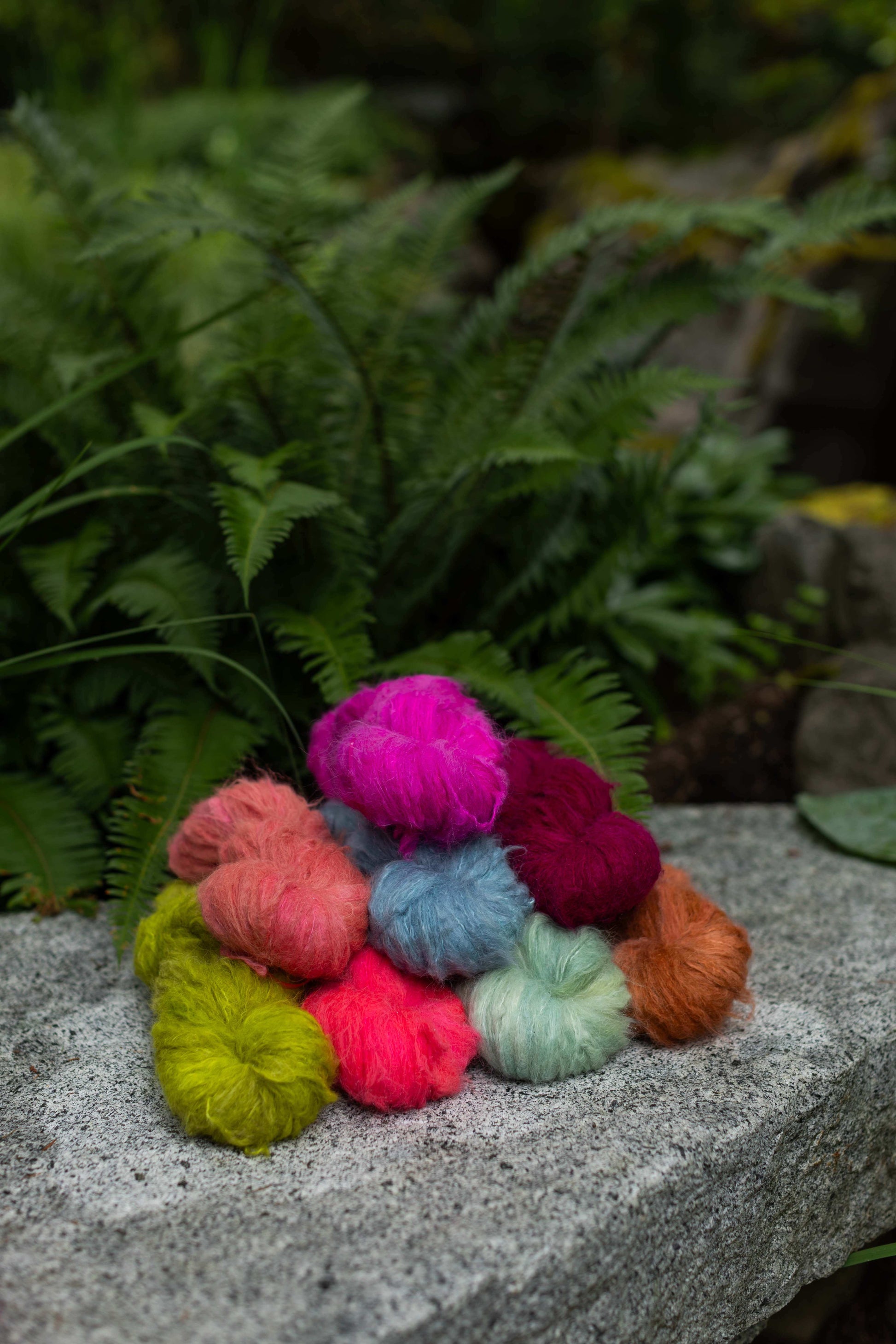 Mho Mho is made with the softest super kid mohair we could find blended with a touch of silk. We’re in love with the way it takes the dye—it has some serious glow! Knit held with other yarns it provides a translucent wash of color and a gorgeous halo of fluff.
