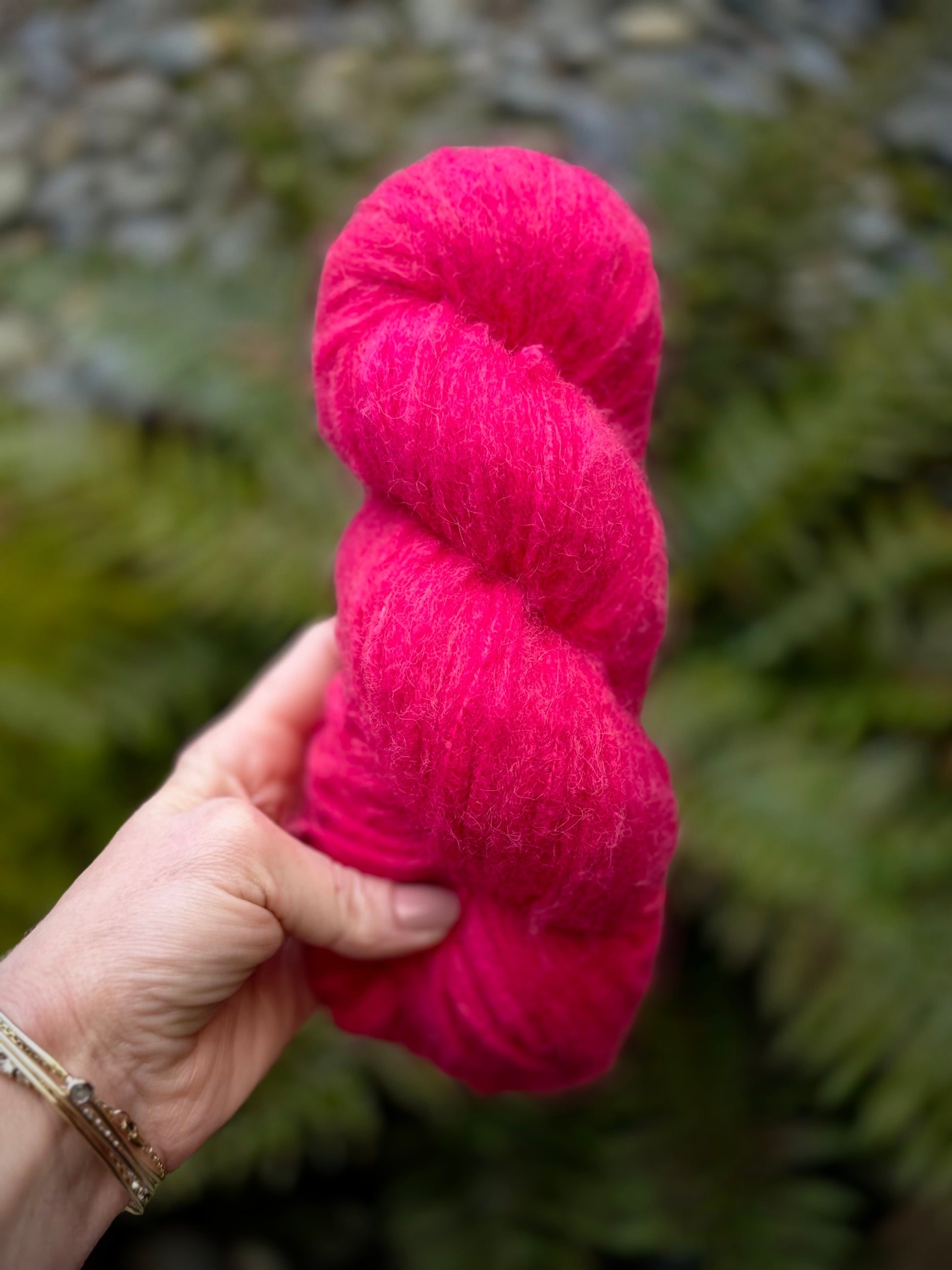 Big Birdie is our custom-milled alpaca/silk blend exclusive to The Lamb & Kid. This is an aran-weight shapeshifter—it can be knit down for a dense and luscious fabric or opened up for a light and airy one. This yarn makes perfectly fluffy sweaters, vests, and the coziest accessories.