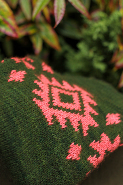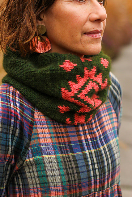 Glamp It Up for a different way of wearing the classic infinity cowl! This snuggly colorwork cowl is knit in the round and grafted, resulting in a sturdy and cozy cowl that will keep you warm throughout the coldest months!