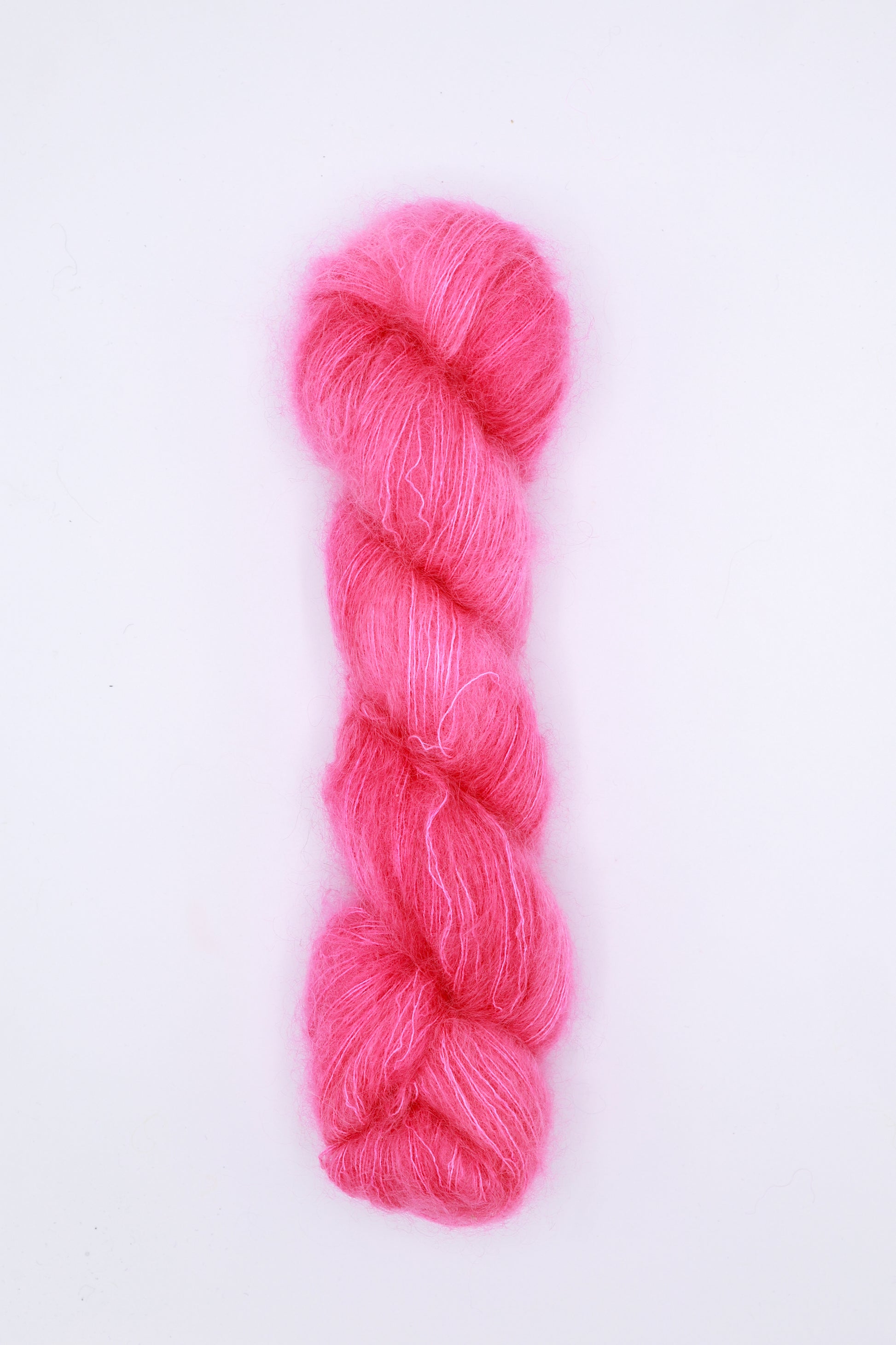 Mho Mho is made with the softest super kid mohair we could find blended with a touch of silk. We’re in love with the way it takes the dye—it has some serious glow! Knit held with other yarns it provides a translucent wash of color and a gorgeous halo of fluff.