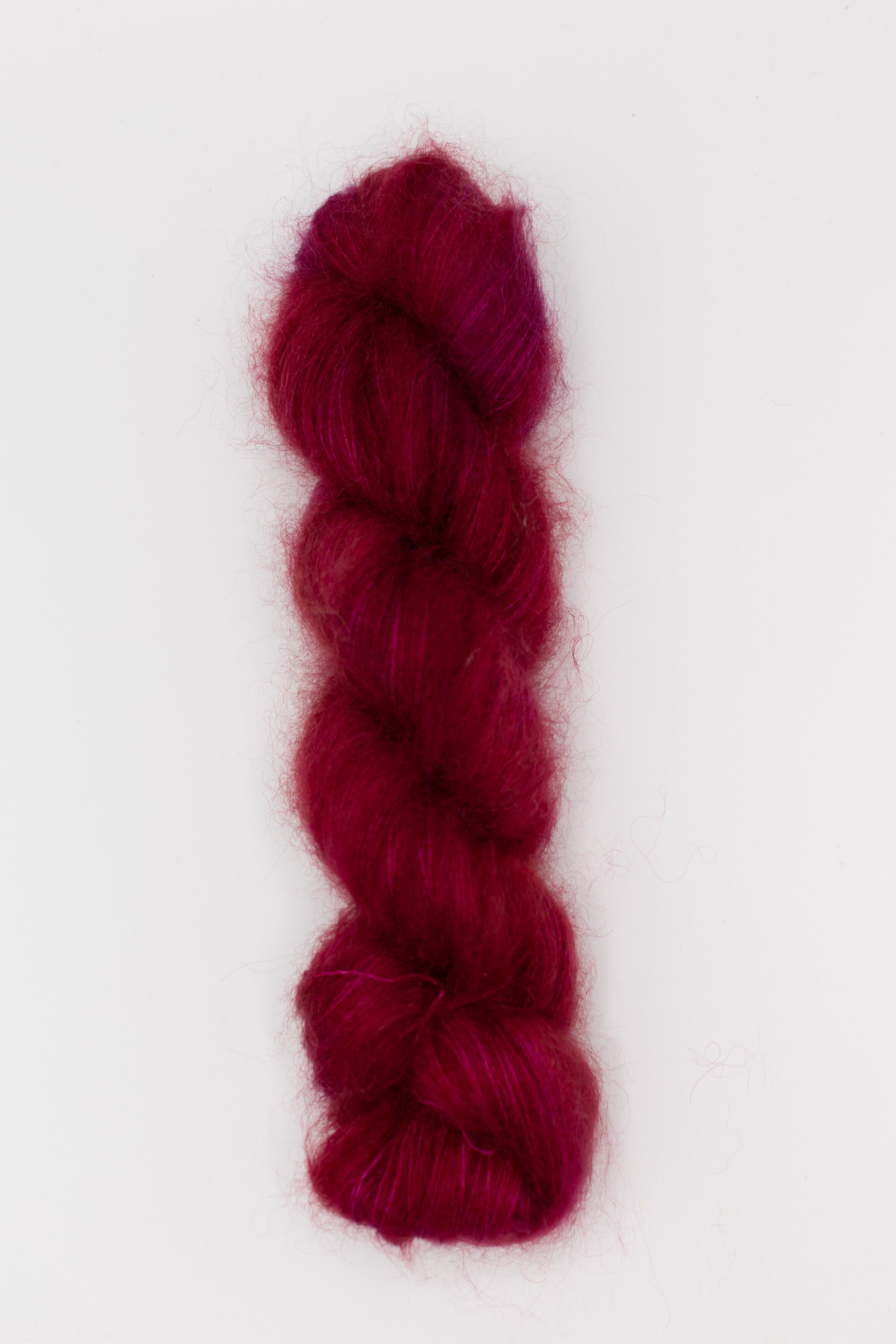 Mho Mho is made with the softest super kid mohair we could find blended with a touch of silk. We’re in love with the way it takes the dye—it has some serious glow! Knit held with other yarns it provides a translucent wash of color and a gorgeous halo of fluff.