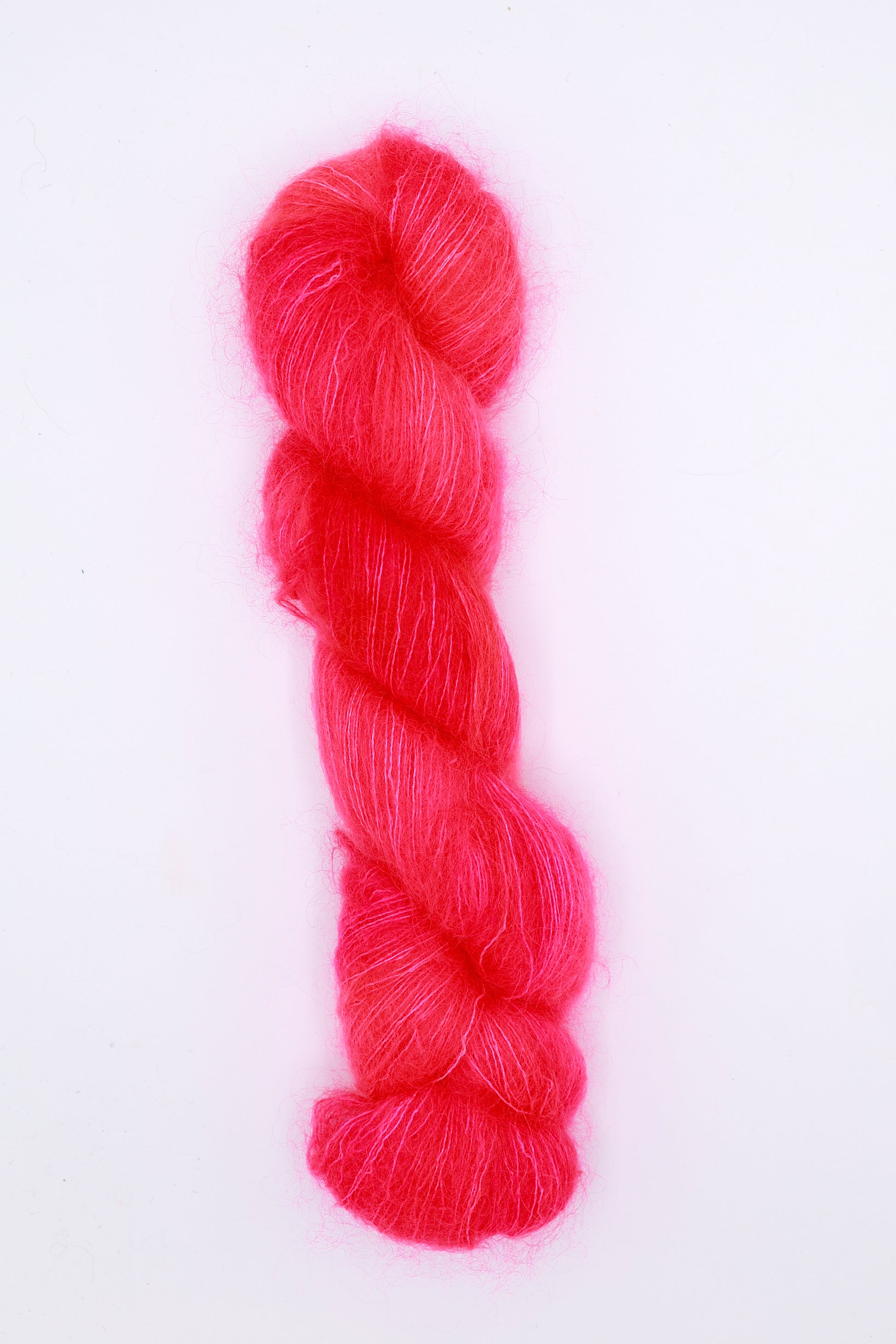 Mho Mho is made with the softest super kid mohair we could find blended with a touch of silk. We’re in love with the way it takes the dye—it has some serious glow! Knit held with other yarns it provides a translucent wash of color and a gorgeous halo of fluff.
