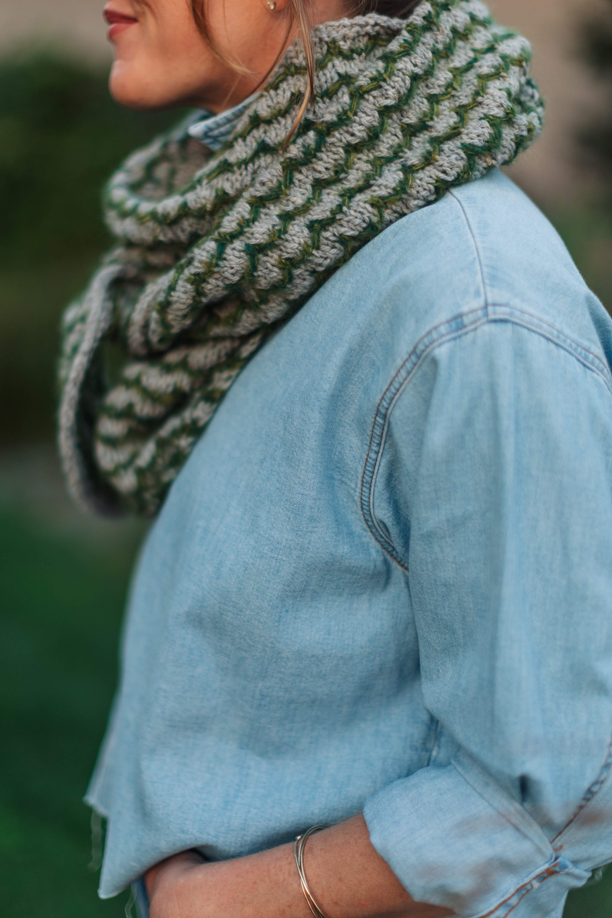 Elmer Tweed Worsted in color Thermal (MC) and Birdie in colors Avocado and Basecamp, one strand of each color held together throughout (CC).