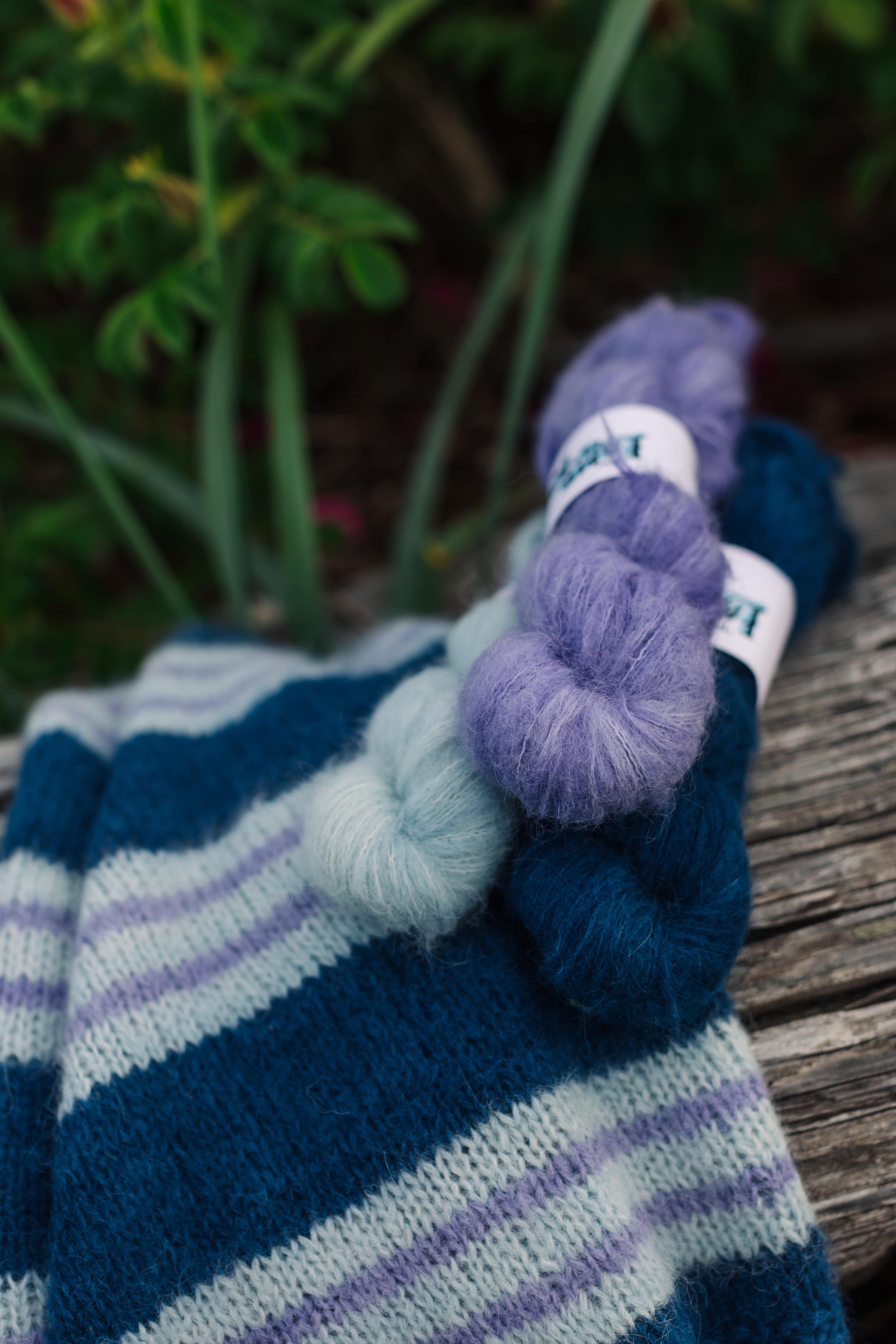 Kit #3: MC, 1 skein Birdie in color Commodore; CC1, 1 skein Birdie in color Icicle; CC2, 1 skein Birdie in color Lilla