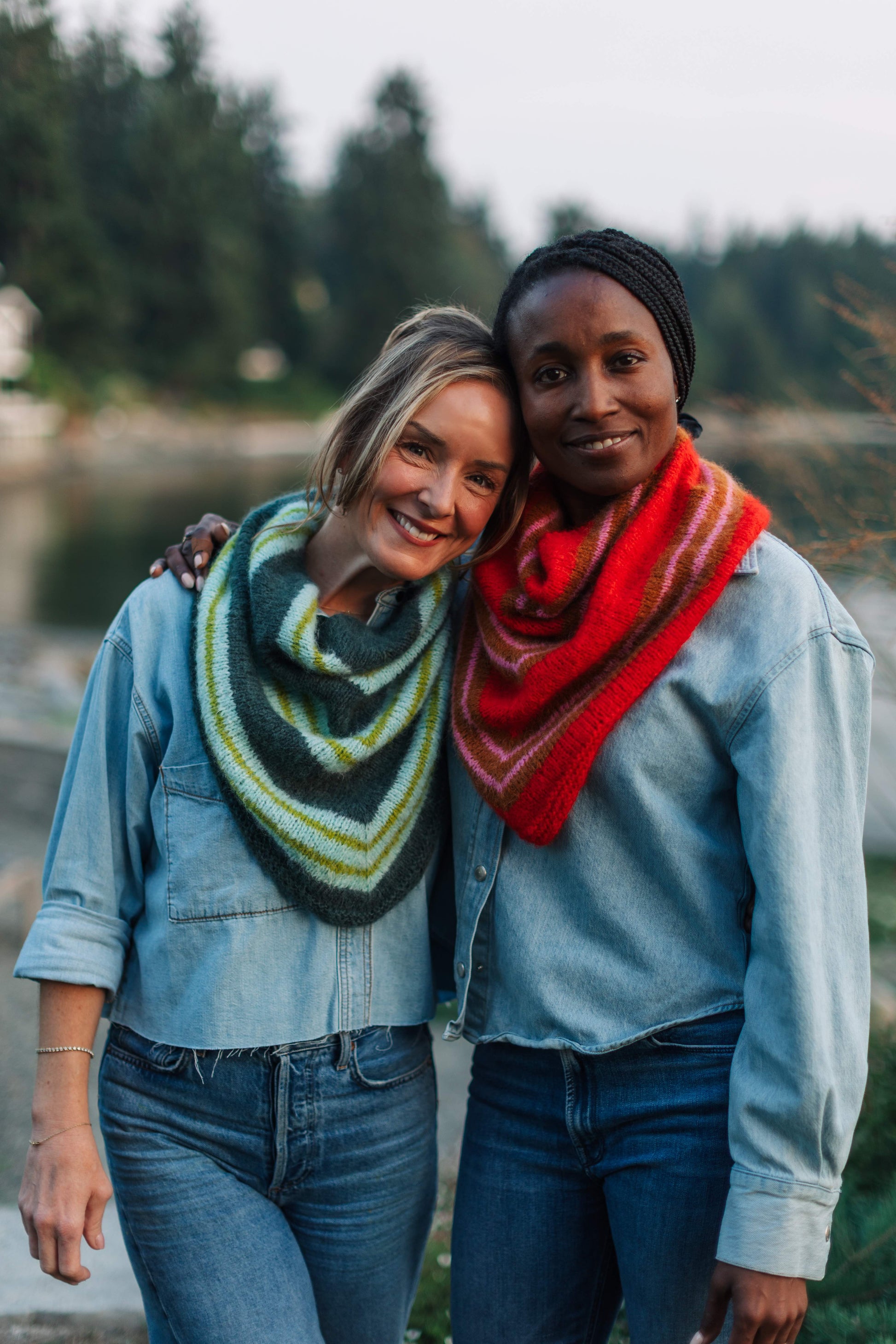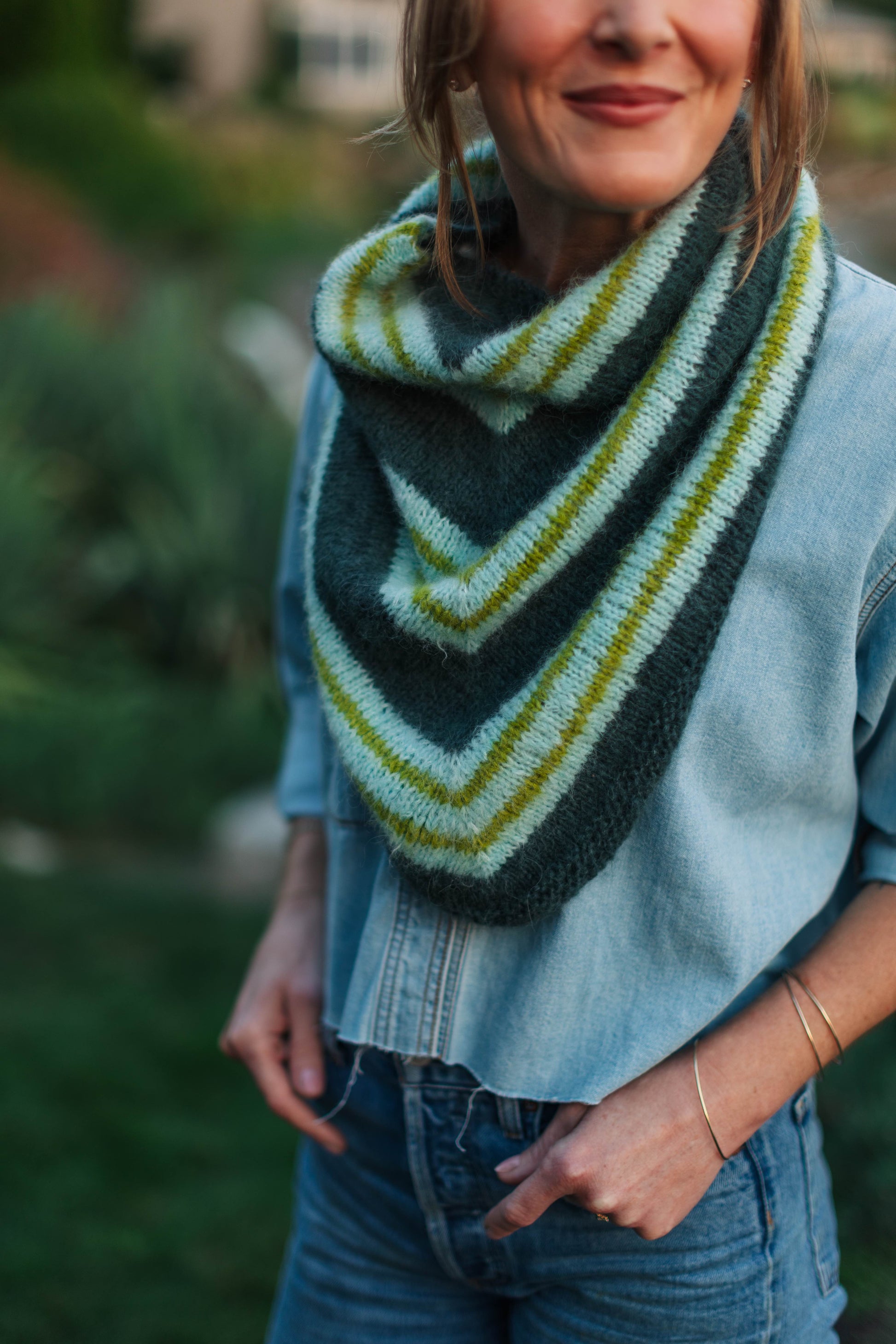 Our alpaca and silk blend, Birdie, is a firm favorite for all kinds of projects—held double, knit by itself, or stranded along with another yarn. For this project, we invite you to pick three colors and enjoy the color play of simple regimental stripes knit into this hybrid triangular shawl and cowl. It’s an easily styled piece that you’ll knit again and again!