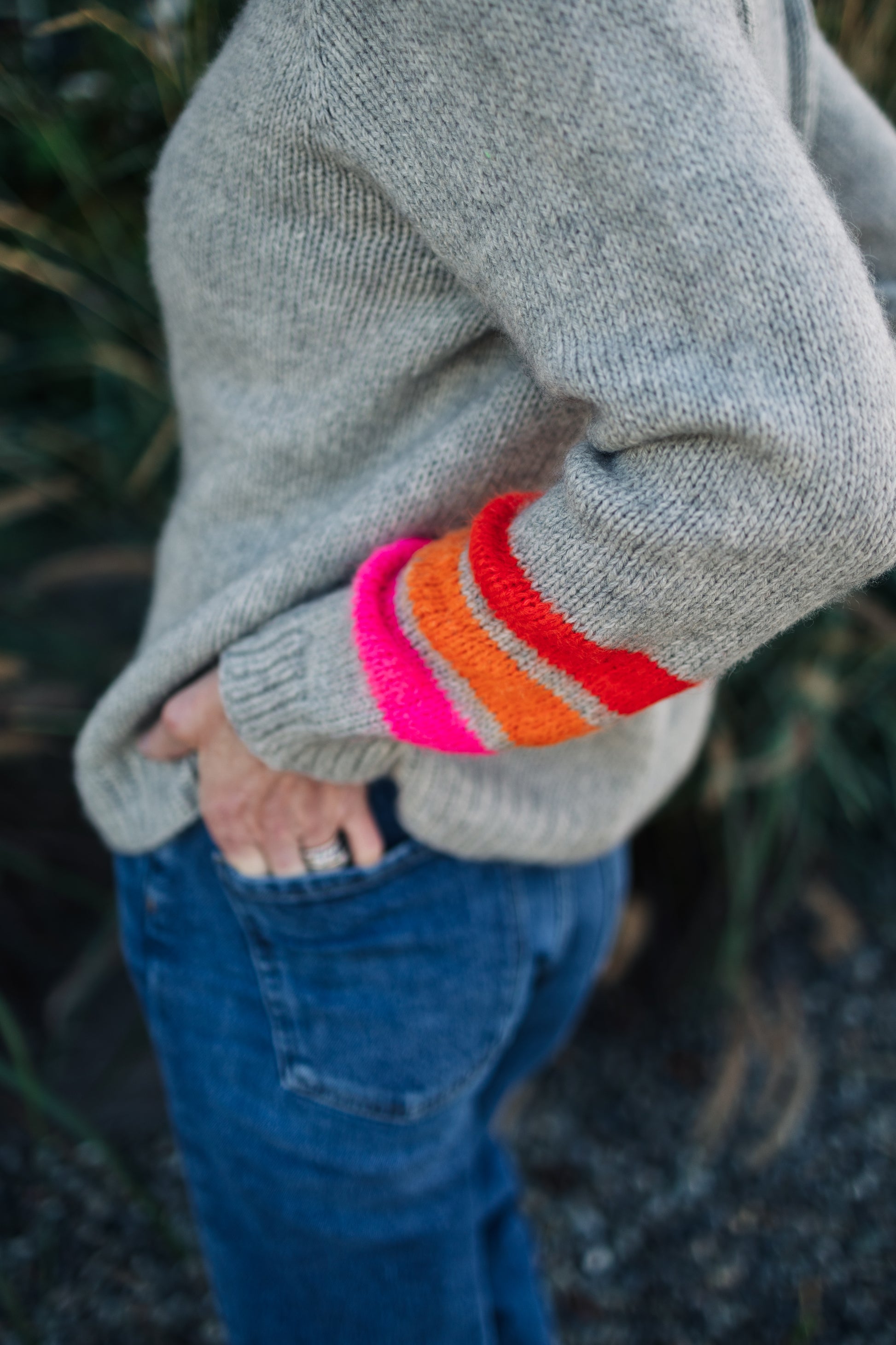 Sweater is meant to be worn with 6-8”/ 15-20cm of ease. Sample shown is size 42.5”/ 106.5 cm, worn with 7”/17.5cm of ease.